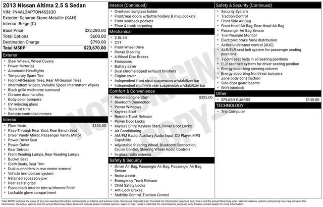 Discover the perfect balance of style, comfort, and performance in the 2013 Nissan Altima 2.5 S. This exceptional sedan combines a sleek exterior, a well-appointed interior, and a powerful yet efficient engine to deliver an unparalleled driving experience.Boasting a host of premium features, the Altima 2.5 S is designed to elevate your daily commute. Enjoy the convenience of remote engine start, the added protection of splash guards, and the comfort of carpeted floor mats. Step inside and experience the refined cloth seating, the intuitive steering wheel-mounted audio controls, and the advanced AM/FM/CD/MP3 audio system.- Remote Engine Start- Splash Guards- Carpeted Front/Rear Floor MatsUnder the hood, the Altima 2.5 S is powered by a 2.5L I4 DOHC 16V engine mated to a fuel-efficient CVT with Xtronic transmission. This combination delivers an impressive 27 city/38 highway MPG, allowing you to spend less time at the pump and more time on the open road.The Altima's impressive performance is matched by its exceptional safety features. Enjoy the peace of mind of advanced systems like electronic stability control, traction control, and a comprehensive airbag system. The four-wheel independent suspension and speed-sensing steering provide a smooth, responsive ride, while the four-wheel disc brakes with ABS ensure confident stopping power.Versatility is also a hallmark of the Altima 2.5 S, with a split-folding rear seat and ample cargo space to accommodate your ever-changing needs. Whether you're commuting, running errands, or embarking on a weekend getaway, this Nissan sedan is ready to rise to the occasion.Experience the perfect balance of style, comfort, and performance in the 2013 Nissan Altima 2.5 S. Visit our showroom today and let us demonstrate how this exceptional vehicle can enhance your driving experience. We're confident you'll be impressed by its exceptional value and quality.