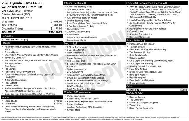 Introducing the 2020 Hyundai Santa Fe SEL, a sophisticated and well-equipped SUV that's ready to elevate your driving experience. This stunning green model boasts a 2.0L turbocharged engine and an 8-speed automatic transmission with SHIFTRONIC, delivering a dynamic and responsive performance.• Cargo Cover• Carpeted Floor Mats• Cargo Net• Option Group 01With its impressive fuel efficiency, this Santa Fe SEL achieves 20 MPG in the city and 27 MPG on the highway, making it an economical choice for your daily commute or weekend adventures. The spacious and well-appointed interior features a range of premium amenities, including:• 12 Speakers• AM/FM radio: SiriusXM• Radio: Infinity Premium AM/FM/MP3 Display Audio• Air Conditioning• Automatic temperature control• Front dual zone A/C• Rear window defroster• Power driver seat• Power steering• Power windows• Remote keyless entry• Steering wheel mounted audio controlsThe Santa Fe's advanced safety features, such as the 4-Wheel Disc Brakes, ABS brakes, and Electronic Stability Control, provide you and your loved ones with the confidence and protection you deserve. Elevate your driving experience with the power of the turbocharged engine, the convenience of the premium features, and the peace of mind that comes with the Santa Fe's comprehensive safety suite.This exceptional SUV also boasts a stunning exterior, with a sleek and modern design that's sure to turn heads. The 19-inch alloy wheels, power moonroof, and power liftgate add a touch of sophistication and convenience to your everyday driving.Experience the ultimate in comfort, technology, and performance with the 2020 Hyundai Santa Fe SEL. Visit our showroom today and let us demonstrate how this exceptional SUV can enhance your lifestyle. We're confident you'll be impressed by the Santa Fe's exceptional value and the unparalleled customer service you'll receive at our dealership.
