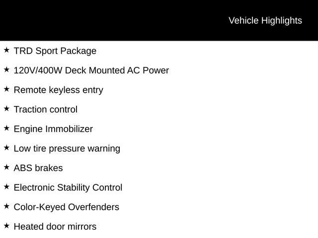 Discover the ultimate off-road companion in the 2020 Toyota Tacoma TRD Sport V6. This rugged and versatile truck is ready to take on any adventure, whether you're conquering the trails or navigating the city streets.- ALL WEATHER FLOOR LINER & DOOR SILL PROTECTOR PKG- TRD Sport Package- 120V/400W Deck Mounted AC Power- Remote keyless entry- Traction control- ABS brakes- Engine Immobilizer- Low tire pressure warning- Electronic Stability Control- Color-Keyed Overfenders- Heated door mirrors- Illuminated entry- Alloy wheels- Power Sliding Rear Window w/Privacy GlassPowered by a robust 3.5L V6 engine delivering 278 horsepower, this Tacoma TRD Sport V6 offers the perfect blend of power and efficiency. With its 4WD capabilities and advanced off-road features, you'll conquer any terrain with confidence. The sleek black exterior and bold styling cues make this Tacoma stand out from the crowd, while the well-appointed interior provides a comfortable and connected driving experience.Elevate your driving experience with the array of premium features, including a premium audio system, heated door mirrors, and a power sliding rear window. Stay connected on the go with seamless integration of your smartphone via Apple CarPlay and Android Auto. Safety is also a top priority, with advanced driver-assistance technologies like automatic high-beam headlights and a rear-view camera to keep you and your passengers secure.Whether you're tackling the great outdoors or navigating the urban jungle, the 2020 Toyota Tacoma TRD Sport V6 is the perfect companion. Its rugged capabilities, impressive performance, and refined amenities make it a true standout in the midsize truck segment. Experience the thrill of driving this exceptional vehicle and schedule a test drive today. We're confident you'll be impressed by its uncompromising capability and versatility.
